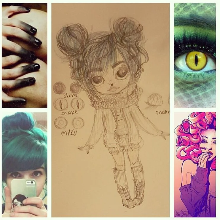 My vision for this new age medusa is a girl with a little bit of punky flair. I wanted her fashion to be very 90s grunge because that decade holds a special place in my heart, and let's face it knee high socks and combat boots are to die for.I wanted her to have teal hair like the bottom left picture, and it took me forever to figure out the easiest way to portray snakes in her hair (since that's kind of her main feature) and I figured that random braids around floral wire or something would probably work the best? I'm not really sure about that part. I can't decide if she would look better tanned or pale, I'm very torn on that part. I do love the idea of her fingers dipped in black though as it could represent her stone powers too.