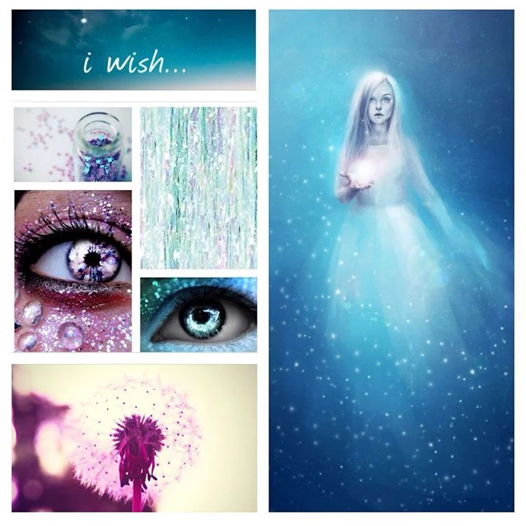 She is not of this world and is an ethereal entity. We never really 'see' her but feel her presence. At first glance she may seem subtle or pale but a closer look shows she is a spectrum of shimmering and sparkling colours. All of her is iridescent and she glows. Her eye colours represent her complexity, with two pairs being alive with bright, illuminous colours and two pairs more cool and muted. Her hair is long and willowy and her clothing is sheer and sparkles. For me, she will always represent hope and for that, she is the most beautiful light.